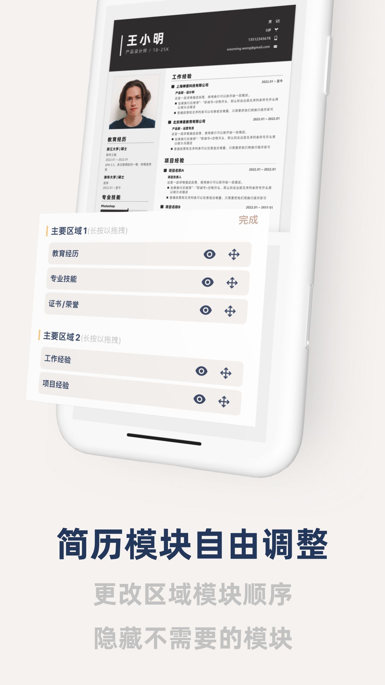 除了主题色以外,简历中的模块你也可以控制顺序和显示隐藏。