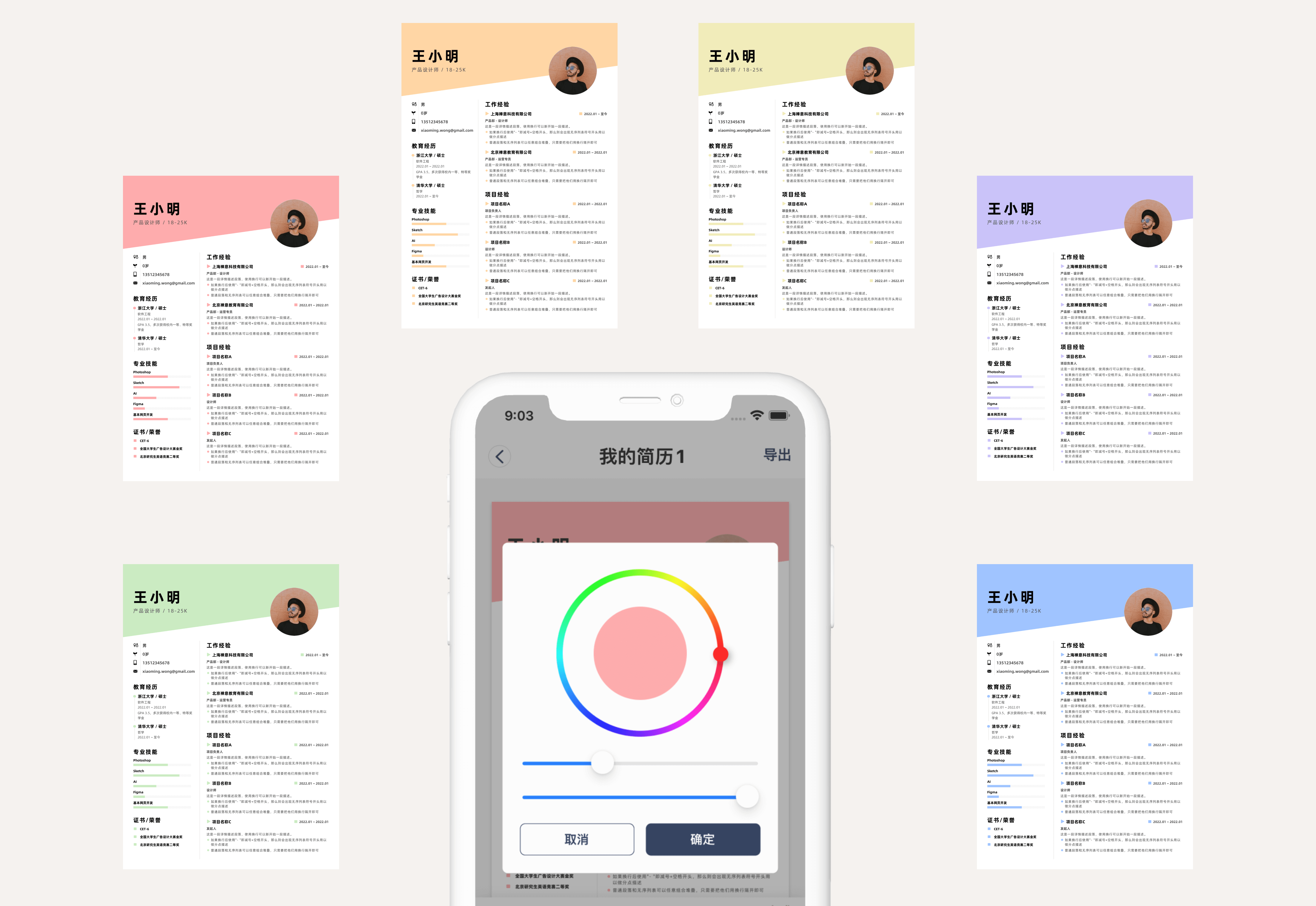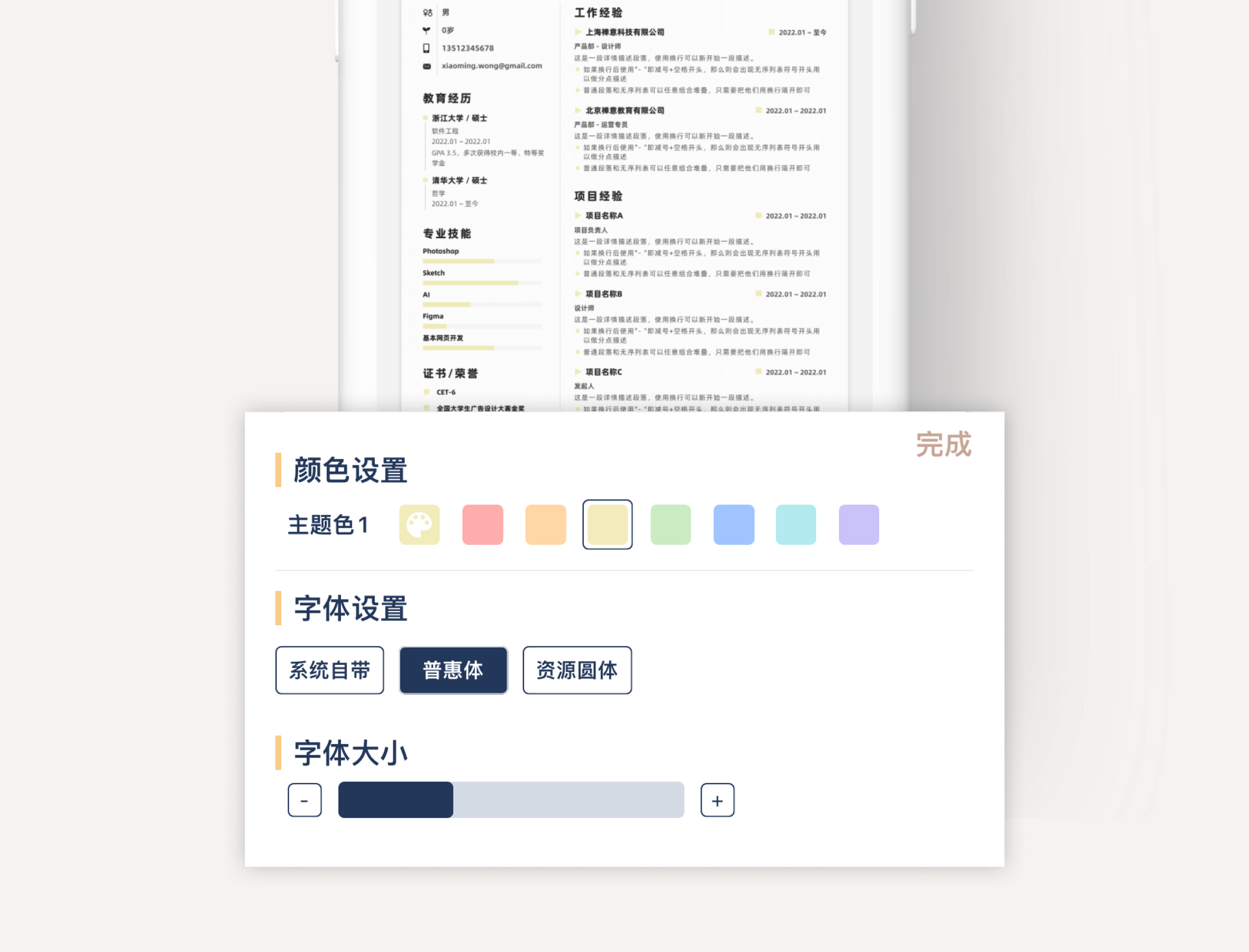 而且如果你选了比较暗/亮的颜色,简历中相关的文字颜色也会做相应的智能调整🥳 。