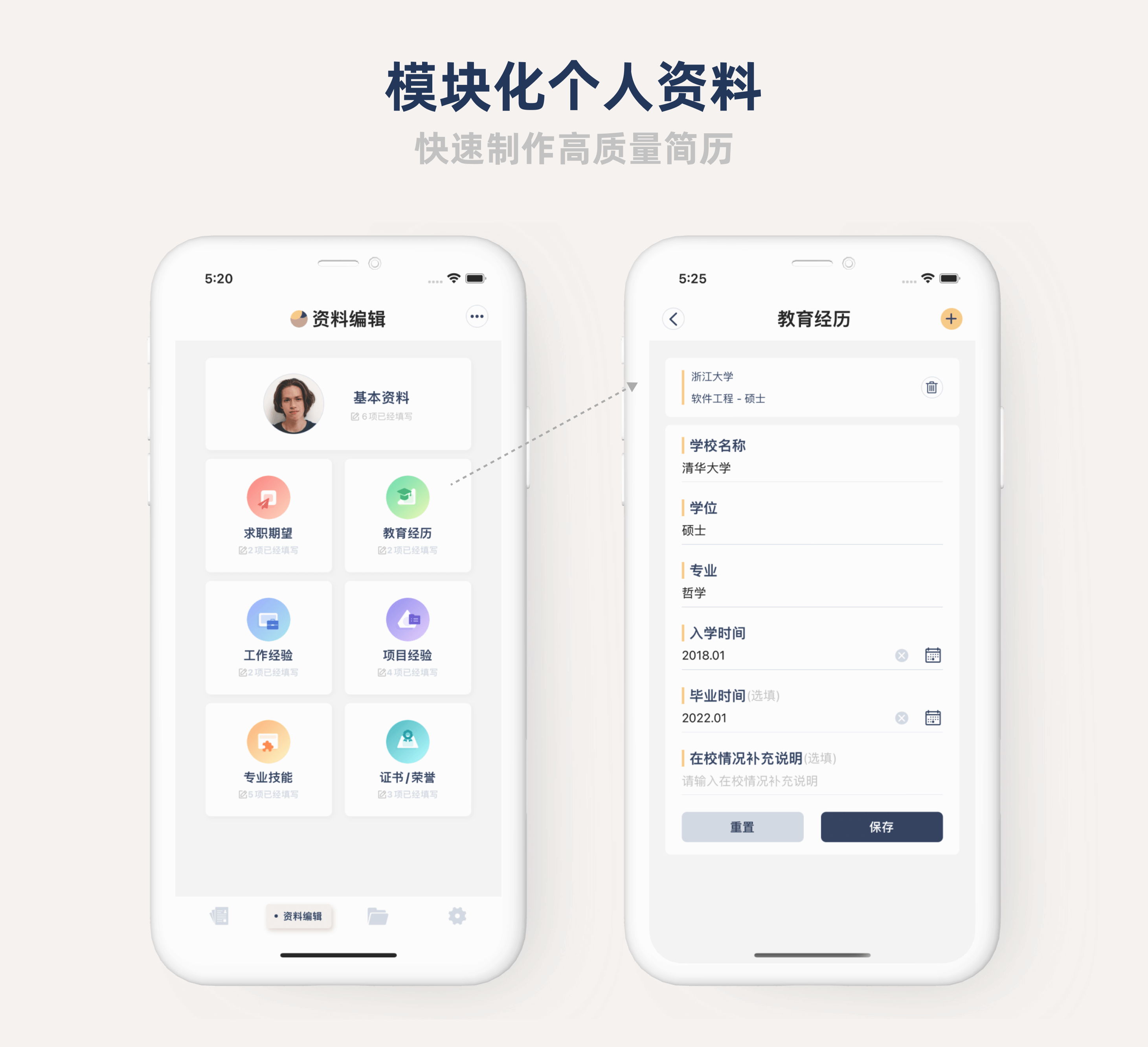 禅意简历帮你把你的个人资料分成了:基本资料、求职期望、教育经历、工作经验等7大模块。